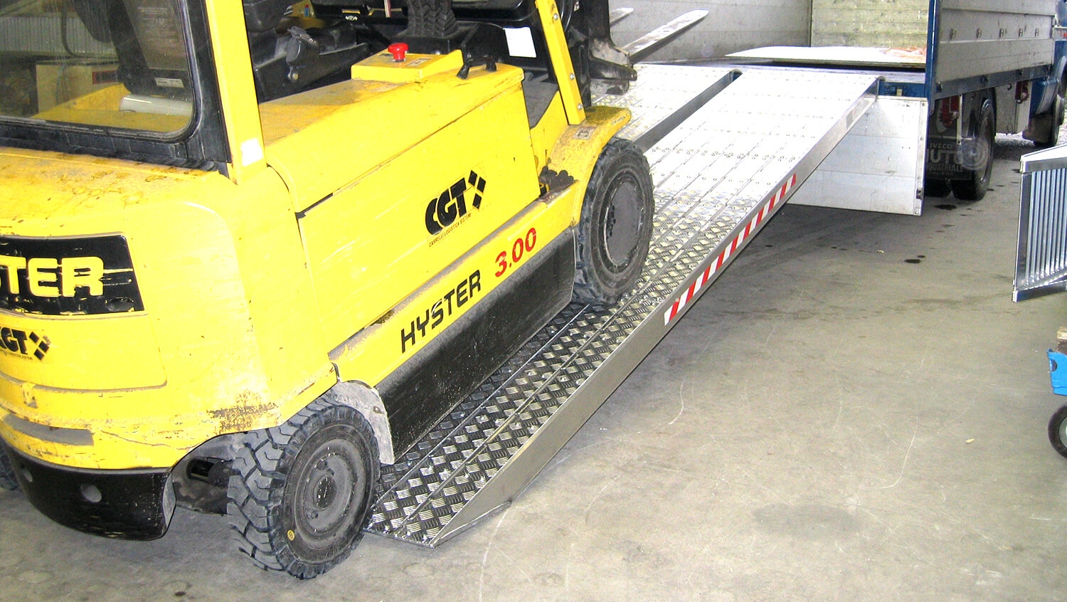 încărcări uniform distribuite în conformitate cu ampatamentul indicat, și în funcție de lățimea rampei. Cu cât distanța dintre roți (ampatamentul) este mai mică, cu atât descărcarea devine mai puțin uniform distribuită, iar astfel se reduce masa care poate fi încărcată, respectiv descarcată. - Rampele pot fi confecționate cu borduri laterale sau fără.